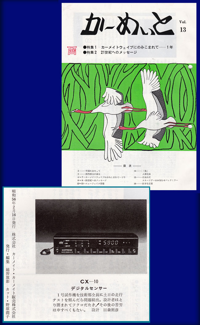 背表紙には、入社とほぼ同時期に発売された期待のカーエレクトロニクス製品『CX-10 デジタルセンサー』の画像がある。アナログメーターが主流の時代に、後付けで回転数/電圧/温度/時計…などをデジタル表示するという斬新な商品だ。