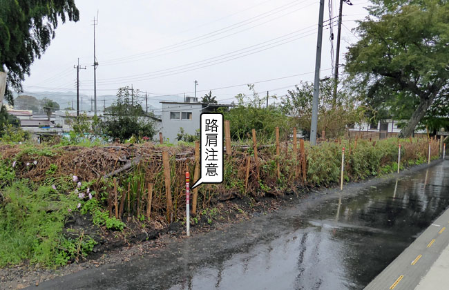 土砂崩れを起こすような高さではないので、これは通行者に対する注意というより、それとなく地主に改善を求めている…ということくらいは察しがつく。いわゆる無言の圧力っていうやつだネ。