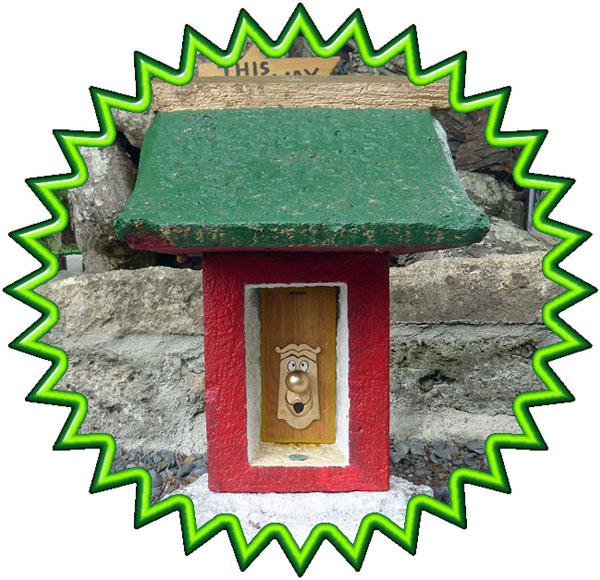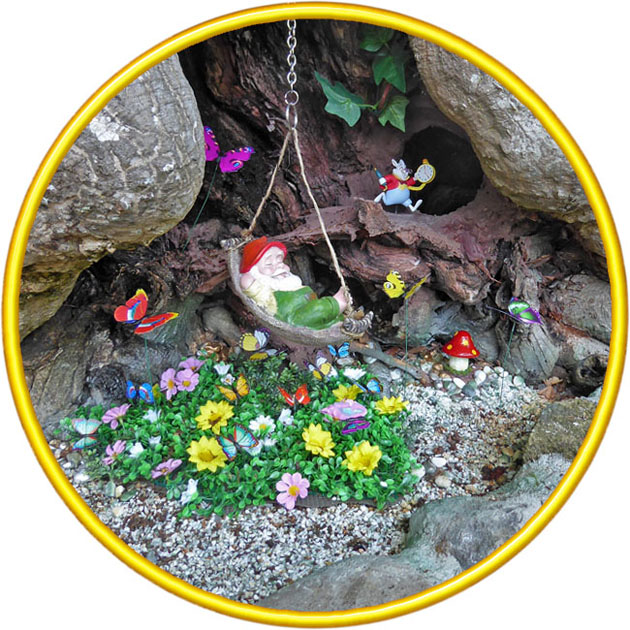 紅葉の祠(ほこら)にある洞窟の入口は、それらしく粘土でこしらえたもの。そして、アリスの世界とは関係ないが、私の化身役でヒマそうに寝ている小人さんがいる。