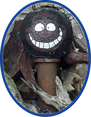 これは、丸い石にそれらしくペイントし、廃物の排水用土管を台にして置いてあるだけだが、注意深く見ないと見逃してしまうかもしれない。そういったことも含めて、興味のある人にしか伝わらない世界となっているのだ。
