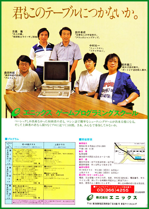 初対面であるのは当然として、そのジョンさんが私のイメージとして持参してきたのが古い雑誌からの拡大コピー。これが何と、1986年にエニックスがたった一度だけ開催した「ゲームプログラミングスクール」を告知した広告だったのだ。