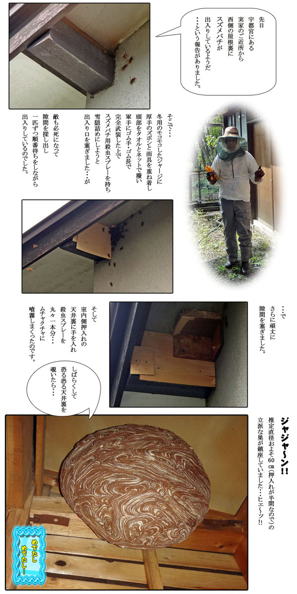 もちろん、その間はこちらも同じ要領でハチの巣退治を繰り返すだけ。どちらが先に諦めるか、いうなればススメハチとの根競べだ。そんなこんなで、およそ1ヶ月後が経過したころ、しぶとかったスズメバチの残党共も、ついに一匹も寄り付かなくなったのであった。
