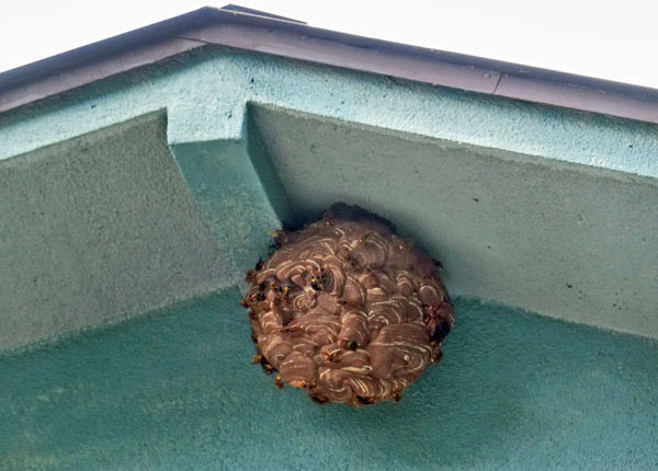 いつから製作を開始したのかは不明だが、すでに直径30cmほどになっているスズメバチの巣。このまま放置しておけば、ますます巨大化していくに違いない。見れば、無数の働きバチが行ったり来たりして、一生懸命に巣作りをしている真っ最中。ウヒャァ〜!