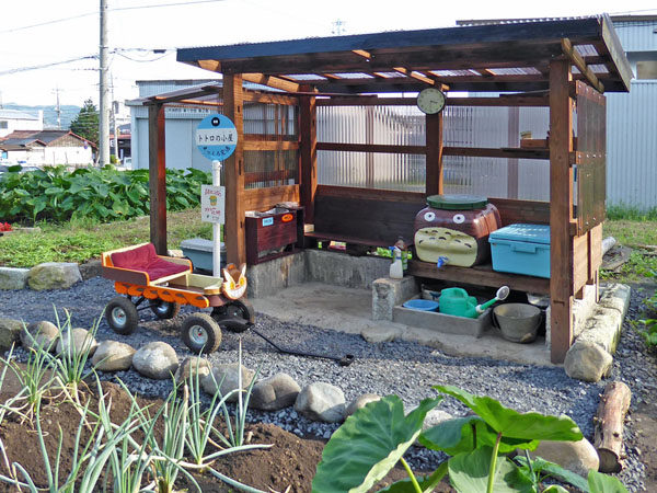 元々は畑に水源がないので貯水タンクを置こうとしたことに始まる。最初はタンクを設置する台座が必要になり、次には屋根を設置しよう→農具も置けるようにしよう→休憩もできるようにしよう→レトロなバス停風にしよう→貯水タンクをトトロにしよう→ネコバスも作っちゃおう→遊び心でバス停も用意しよう…というふうに、次々と夢が膨らんでこうなってしまったのだ。