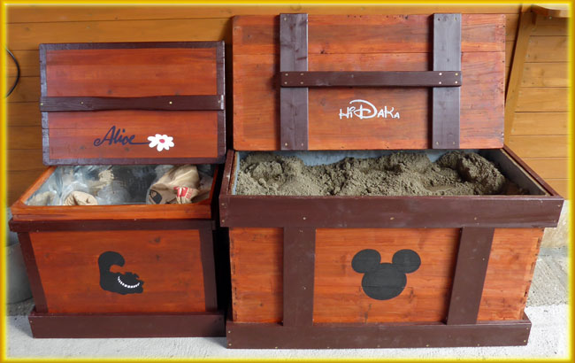 残念ながら、高価なお宝はないので、中に入れるのは砂とセメント。これまでホームセンターで買ったままビニール袋を並べていたけれど、これでスッキリとまとめられる。しかも、いつの日か小さなゲストが喜んでくれるに違いない。古い茶箱だって、現代に復活して心なしかイキイキしてるでしょッ!