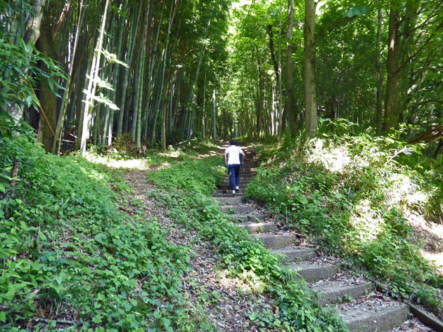 半ばを過ぎると、整然とした石段から擬木による段差となる。擬木から次の擬木までの間隔は、およそ80cm前後。歩幅としては広めだけど、ここは大股でノッシノッシと歩くことを、自分なりの秘めた流儀としている。