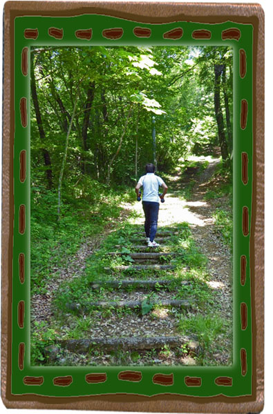 たとえ両手にダンベルを持っていても、この程度の歩行は「どうってことない!」のだ。ただ、上を見ると風景に圧倒されて長い道のりに思えてしまうので、足元を見ながら段数を数える。しょせんは450段ほどの遊歩道だ。