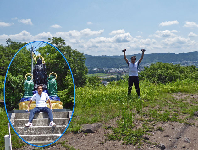 そうこうしているうちに、およそ8分の時間が経過して頂上に到達する。子供のころは六角堂というお堂があったが、それがなくなって鉄製の展望台となり、それも数年前に取り壊され、現在はブロンズの派手な毘沙門天像が飾られている。