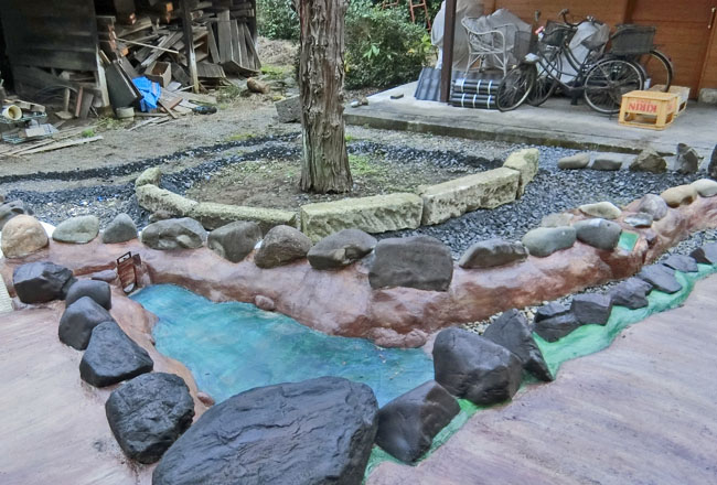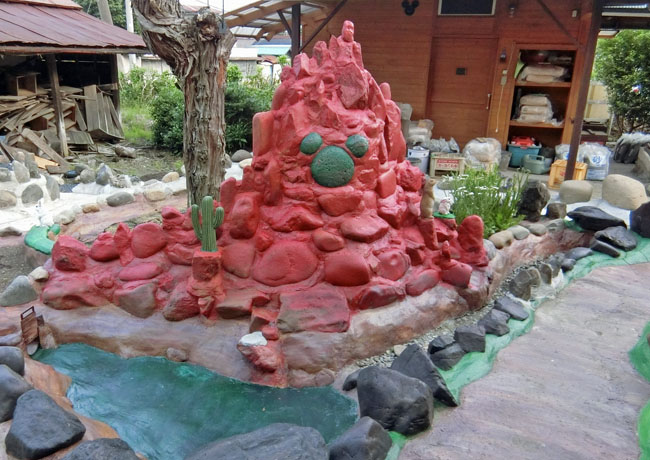 こうして、あれやこれやと気配りと失敗を繰り返しながら、数ヶ月かけて降臨して来たイメージ上の景観が姿を現したのであった。高さ2メートルほどの岩山だけど、処分せずに確保していた廃石などを一輪車で運び、総計1トンを超えるモルタルを練り、ようやく築き上げた汗とホコリの結晶。客観的には、こういうものを道楽というのだろう。