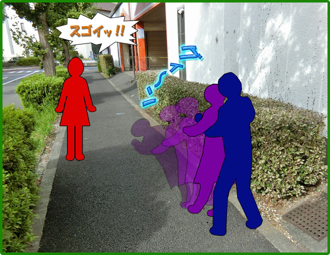 怪訝そうな顔をしながらも、とりあえず自転車を止めて「はい?」と答えます。女性は「人が倒れていて、一人では起こせないから手伝ってくれませんか?」と懇願します。こちらからは道路脇の植え込みで状況が呑み込めません。事件だったらイヤだし、どうしよう…???