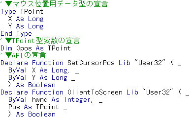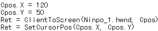 まずは、上記の内容を宣言しておく。VBにはPoint型が用意されていないので、自分でタイプ宣言をしなければならない。後は、スクリーン座標をCposにセットして、一発コールでボン……というわけだ。もし、指定したい座標が特定フォーム内にある場合は、それをスクリーン座標に変換すればよい。例えば、Ninpo_1というフォームの特定座標(120,50)にマウスカーソルを移動したいなら、次のような具合だ。非常に簡単なので、ぜひアチコチで気配りをしてもらいたい。